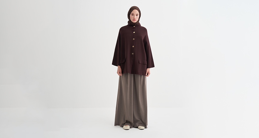 Koleksiyonun tamamlayıcı dış giyim parçalarından More Panço Mürdüm, mevsim geçişlerinde serin havalardaki koruyucu rolüyle öne çıkıyor. Yumuşak dokusu ve rahat kesimiyle katmanlı bir görünüm sunarken, mürdüm rengi ile sıcak bir his yaratıyor. Pantolon, elbise veya triko takımlarla kolaylıkla kombinlenebilen bu panço, hem konforu hem de estetiği aynı anda sunuyor.