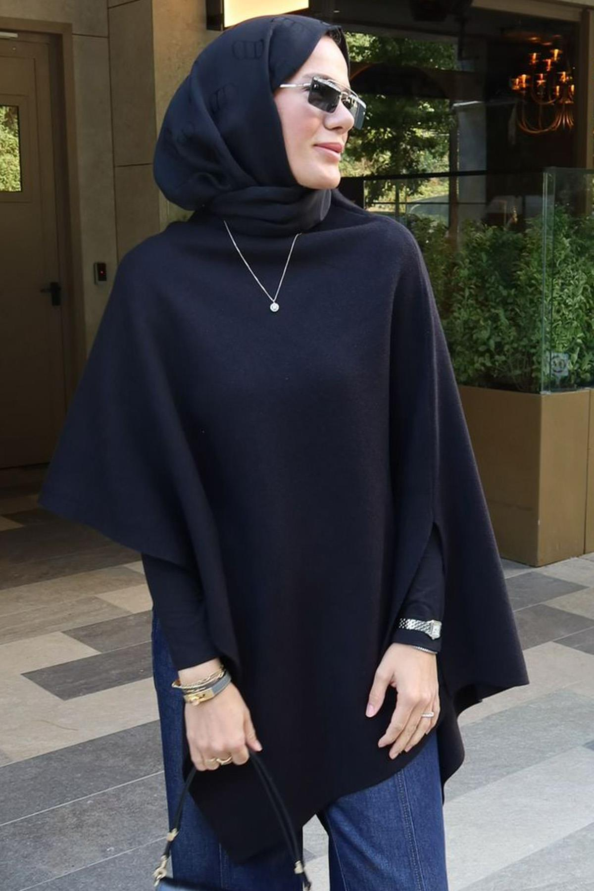 Modern kesimi ve esnek yapısıyla öne çıkan asimetrik triko panço, çok yönlü kullanım imkânı sunar.