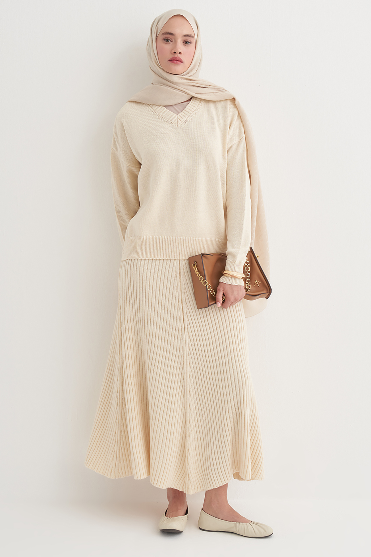 FİTİLLİ TRİKO ETEKLİ TAKIM ÖZELLİKLERİ Zamansız şıklığı konforla buluşturan fitilli triko takım, ayrı ayrı da kullanılabilen parçalardan oluşur. Standart bedeni, 36–40 arası bedenlerle uyumludur. • Fitilli triko dokusu • Üst boy: 60 cm • Etek boy: 95 cm • Parçalar ayrı kullanıma uygundur • Standart beden (36–40 uyumlu)