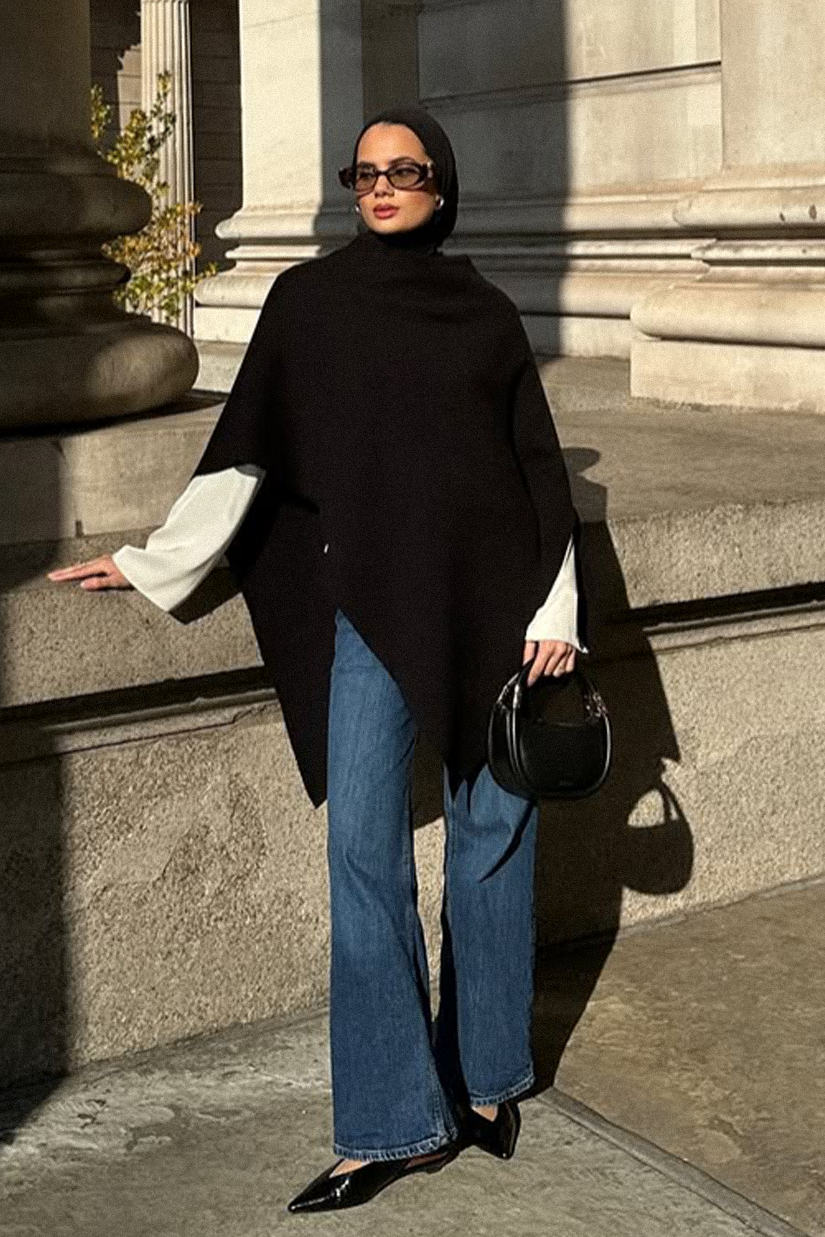Modern kesimi ve esnek yapısıyla öne çıkan asimetrik triko panço, çok yönlü kullanım imkânı sunar.